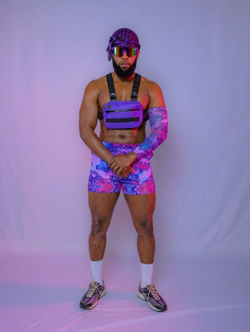 This look is defined by its tactical-meets-celestial design, featuring vibrant purple Branded 2026 Shorts adorned with our signature neon mandalas and intricate calligraphy, balanced by high-performance tactical gear.